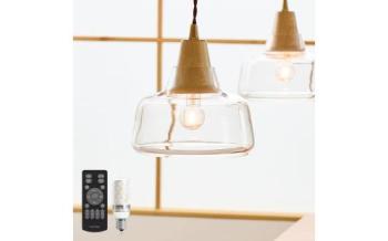 はい。まず《Aslic》は天然木×ガラスの組み合わせが特徴で、サイズもコンパクト。キッチンやダイニング、玄関など、どこに吊るしても圧迫感が出にくいライトでしたね。さらにE17電球が自由に選べるので、明るさも色味も自分好みに調整しやすいのがポイントです。