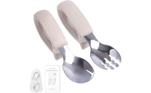 自分で食べる練習にも! 離乳食用のスプーンとフォークがセットになったベビーカトラリーです。このカトラリーは、赤ちゃんが自分で食べる練習を始めるために最適です。グレージュ(グレー)のデザインがシンプルでおしゃれで、赤ちゃんが楽しく食事を楽しむことができます。