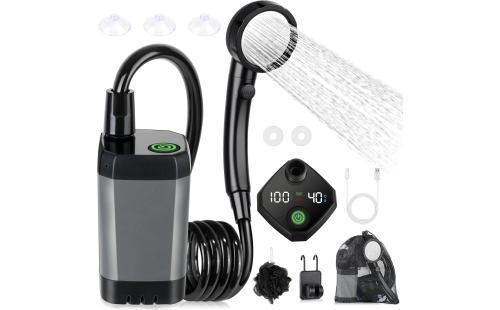 ユーザーはポータブルシャワーを持参し、キャンプ場で使用します。シャワーポンプには6000mAhのバッテリーが内蔵されており、充電器などで簡単に充電できます。デジタルディスプレイで水温や電力状態を確認しながら、適温のシャワーを楽しむことができます。