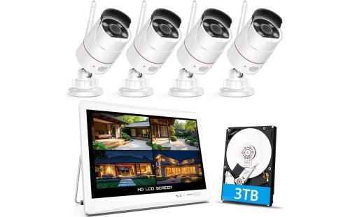 【500万画素対応・金属製】 防犯カメラ 屋外 ワイヤレス 12インチモニター AI人検知 双方向通話 3TB HDD内蔵 10台増設 H.265圧縮 発光威嚇 フルカラー暗視 YESKAMOO 監視カメラ 無線 家庭用 IP66防水防塵 WiFiカメラ 24時間常時録画 動体検知 スマホ/PC遠隔監視(300万画素ワイヤレス防犯カメラ4台+500万画素防犯モニター付き録画機+3TB HDD) : DIY・工具・ガーデン