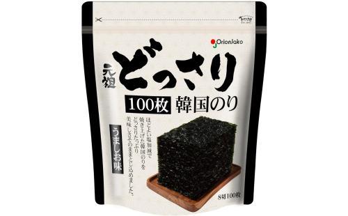 「どっさり」と聞いて想像する量の、さらに上をいくかもしれません。オリオンジャコーの《どっさり韓国のり うましお味》は、8切サイズの韓国のりが100枚も入った大容量パック。しかも価格はワンコインちょっと(※時期や店舗によって変動あり)と、コスパも抜群です。