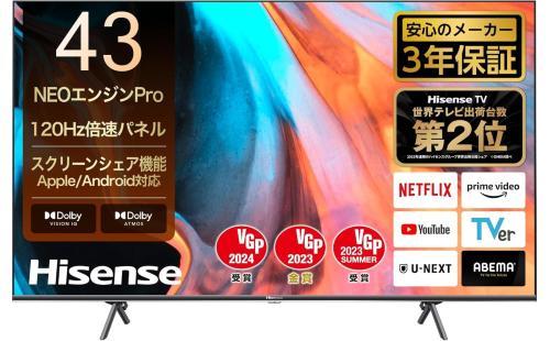 ハイセンス 43V型 倍速パネル搭載 液晶 テレビ 43E7H 4Kチューナー内蔵 ネット動画対応 3年保証 2022年モデル