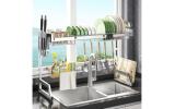 ステンレス製で頑丈な構造を持ち、食器や調理器具を効率的に収納できる水切りラック。