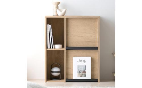 ナチュラル×ブラックの配色は、空間にほどよいアクセントを加えてくれて、どんなインテリアにもすっと馴染む。しかもフラップ扉付きだから、生活感のあるアイテムはサッと隠して、雑誌やお気に入りの小物は“見せる収納”としてディスプレイ可能。