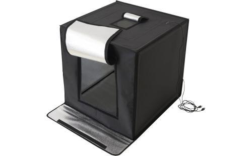 サイズは約64×62×63cmと、ちょっとした棚くらいの大きさ。重さは約4.5kgで、持ち運びもそこそこラク。内部にはLEDライトが60個搭載されていて、光が均一に回るから影が消えるという魔法のような効果も。背景紙は白・黒・グレーの3色付きで、雰囲気に合わせてチェンジ可能。電源はUSB式なので、モバイルバッテリーでもOKという気軽さもポイントです。
