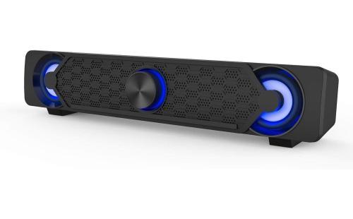 見た目はゲーミング感たっぷり。中央の物理ボリュームノブは操作しやすく、青く光るLEDライトが夜のプレイ環境をちょっと“映え”させてくれるのがポイント。設置も簡単で、ディスプレイ下にすっきり収まるサイズ感です。