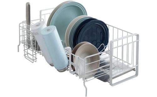 耐久性と使い勝手:このアール スライド伸縮式水切りラックはスチール製で耐荷重が約10kgあり、大容量で多機能な設計です。水切りトレーは傾斜が付いており、水分が直接シンクに落ちるためお手入れが簡単です。