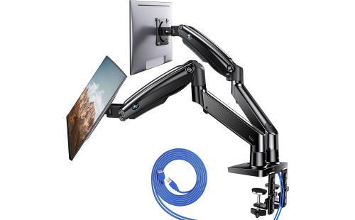 このモニターアームは13~35インチのモニターに対応し、デュアルモニターセットアップが可能。TechGuruは、片方の画面を仕事用に使い、もう片方を情報収集やコミュニケーション用に活用することができる。