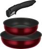 サーモスのデュラブルシリーズから登場した、取っ手が着脱可能な便利なフライパン3点セットです。カラーはディープレッドで、キッチンに映えるデザイン。