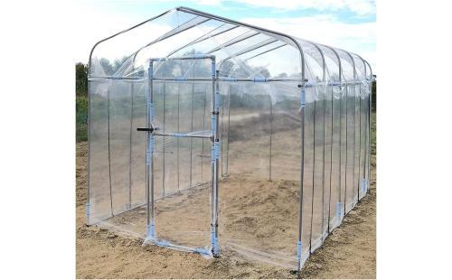 はい、「DAIM ドア付き2坪温室ハウス」という商品で、幅2.2メートル、奥行3メートル強、高さが2メートルちょっとというサイズ感。農業用ビニールで、日光と保温のバランスがとても良いんです。前後に開き戸があるので通気性も抜群なんですよ。