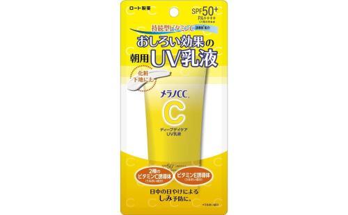 メラノCC ディープデイケアUV乳液は、日焼け止め乳液化粧下地の3役をこなす朝用UV乳液です。SPF50+/PA++++の高い紫外線カット効果と、美容成分による保湿・トーンアップ効果を両立しています。