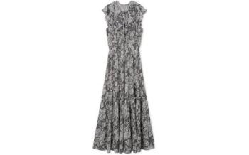 繊細なプリント柄はオフィスでも浮かず、それでいて華やか。ウエストの切り替えとプリーツのおかげで立体感が出て、着るだけでスタイルアップできます。袖のフリルも程よくフェミニンで、クライアントとの打ち合わせでも柔らかい印象に。