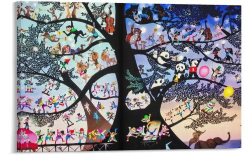 デザインは、影絵作家・藤城清治さんの世界観にインスパイアされたもの。夜の街並み、街灯の光、そしてシルエットで描かれた人物──どこか懐かしく、静かな物語が流れているような雰囲気です。見る人によって、感じる“物語”が違うのも魅力のひとつ。まるで、絵が心の中でそっと語りかけてくるようです。