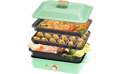 このモデル(プレート3枚-グリーン)は、焼く・煮る・丸めるの三役をこなす多機能卓上調理器。見た目はコンパクトでも、1200Wの高火力でしっかり調理できる頼れる一台です。