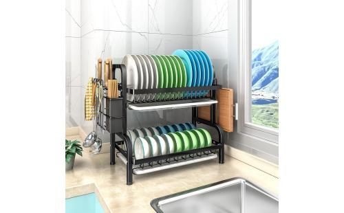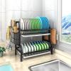 SVOHZAV 水切りラック 横置き 水切りかご 錆びない 2段式 大容量 ディッシュラック キッチン収納 水が流れる 食器乾燥 皿立て 箸収納 包丁スタンド まな板立て 組み立て簡単 (2段式, ブラック)