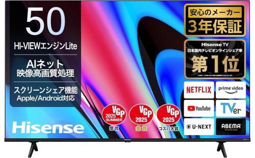 【Amazon.co.jp限定】ハイセンス 50V型 50E60N 4K スマート Wチューナー内蔵 ネット動画 液晶 テレビ HDMI2.1 低遅延ゲームモード Alexa AirPlay2 3年保証 2024年モデル