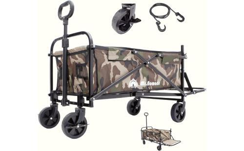 このワゴン、見た目はゴツめの迷彩柄ですが、中身はかなり気が利いてます。容量はたっぷり130L、耐荷重は100kgと、子どもも荷物もまとめて乗せられる頼もしさ。しかも軽量設計で、女性でも扱いやすいのがポイントです。