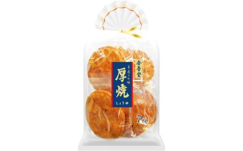 金吾堂の《厚焼しょうゆ 7枚入》は、老舗煎餅メーカーが手がける王道のしょうゆ煎餅です。粗挽き米を使った生地を直火でじっくり焼き上げ、香ばしいしょうゆだれをまとわせることで、ガリッとした食感と濃厚な風味を実現しています。