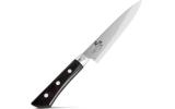 刃渡りは130mmで、刃部はステンレス刃物鋼、ハンドルはステンレス製です。日本正規販売品で、高品質で錆びにくい特殊ステンレス鋼を使用しています。この包丁は、カニなどの硬い食材にも使える用途多彩な万能タイプです。食洗機対応で、衛生的なマイクロエッジング加工が施されています。