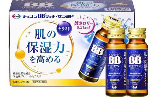 「チョコラBBリッチ・セラミド 50mLx10本」は、機能性表示食品で、肌の保湿力を高めるために米由来グルコシルセラミドを配合しています。ラ・フランス味で美味しく、低カロリー(8.2kcal)でノンカフェインです。