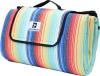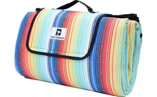 Blue Giraffeのレジャーシートはチェック柄ではなく、ストライプ柄(レインボー)のデザインです。カラフルでおしゃれな印象を与えます。