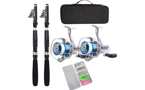 このセットには、炭素繊維とガラス繊維の混合構造の釣り竿が含まれており、強く引っ張っても折れにくい特徴があります。また、5.2:1の高速歯車比率のスピニングリールが2個付属しています。