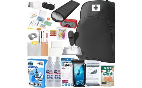 防災士が監修した防災セット。防水リュックに32点の必需品が揃っており、災害時に必要なアイテムを網羅しています。寝袋や保存水などが含まれ、非常時の備えに最適です。