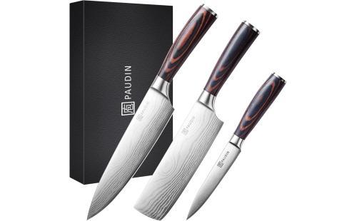 PAUDINの包丁セットは、5Cr15Mov高炭素ステンレス製の高品質包丁3点セット。耐久性と切れ味を兼ね備え、防錆加工で長持ちするため、料理好きに最適です。