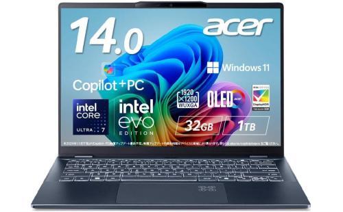 Acer Swift 14 AI Core Ultra 7は、32GBメモリーと1TB SSDを搭載し、高速処理と大容量ストレージを提供します。インチOLEDディスプレイで美しい映像を楽しめます。